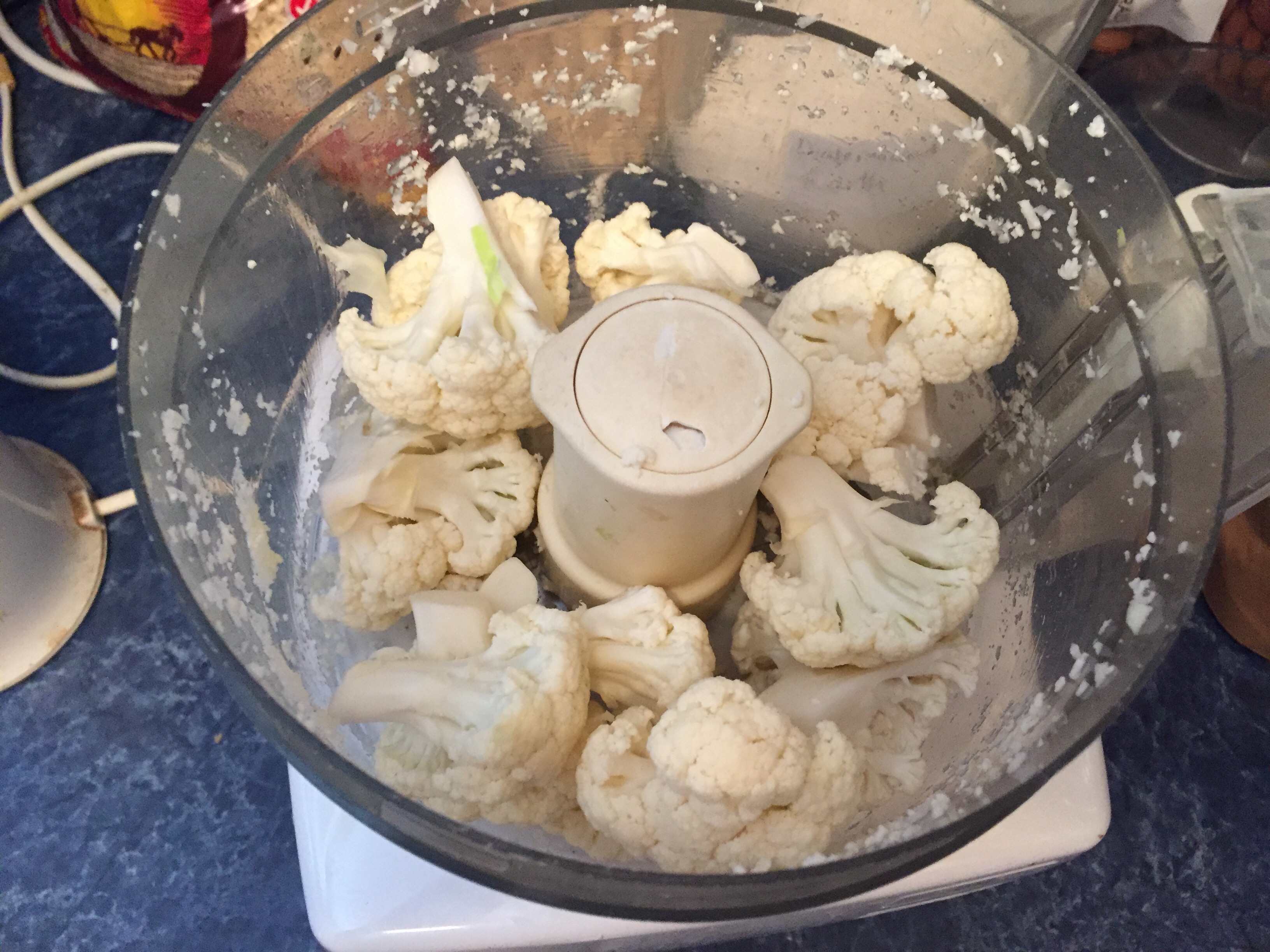 Put cauliflower florets (a few at a time) in kitchen whizz and blitz until it looks like snow or rice. Add a couple of centimetres of boiling water, cover and cook for about 4 or 5 mins