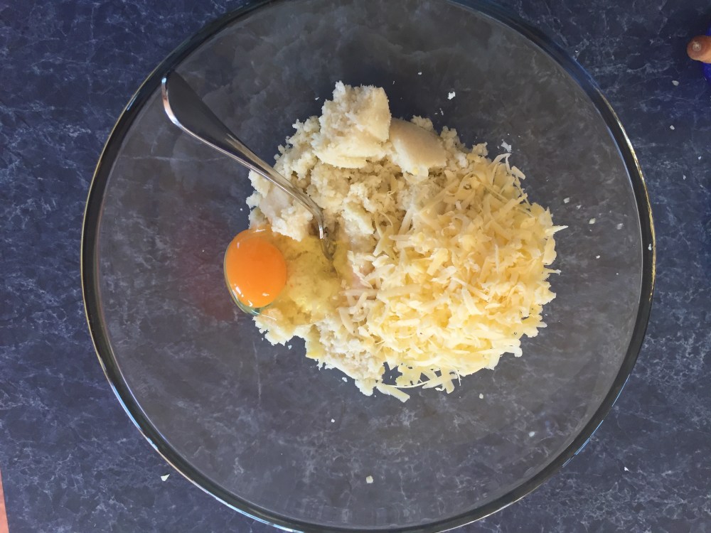 Empty into a bowl and add the egg, grated cheese and herbs and spices.