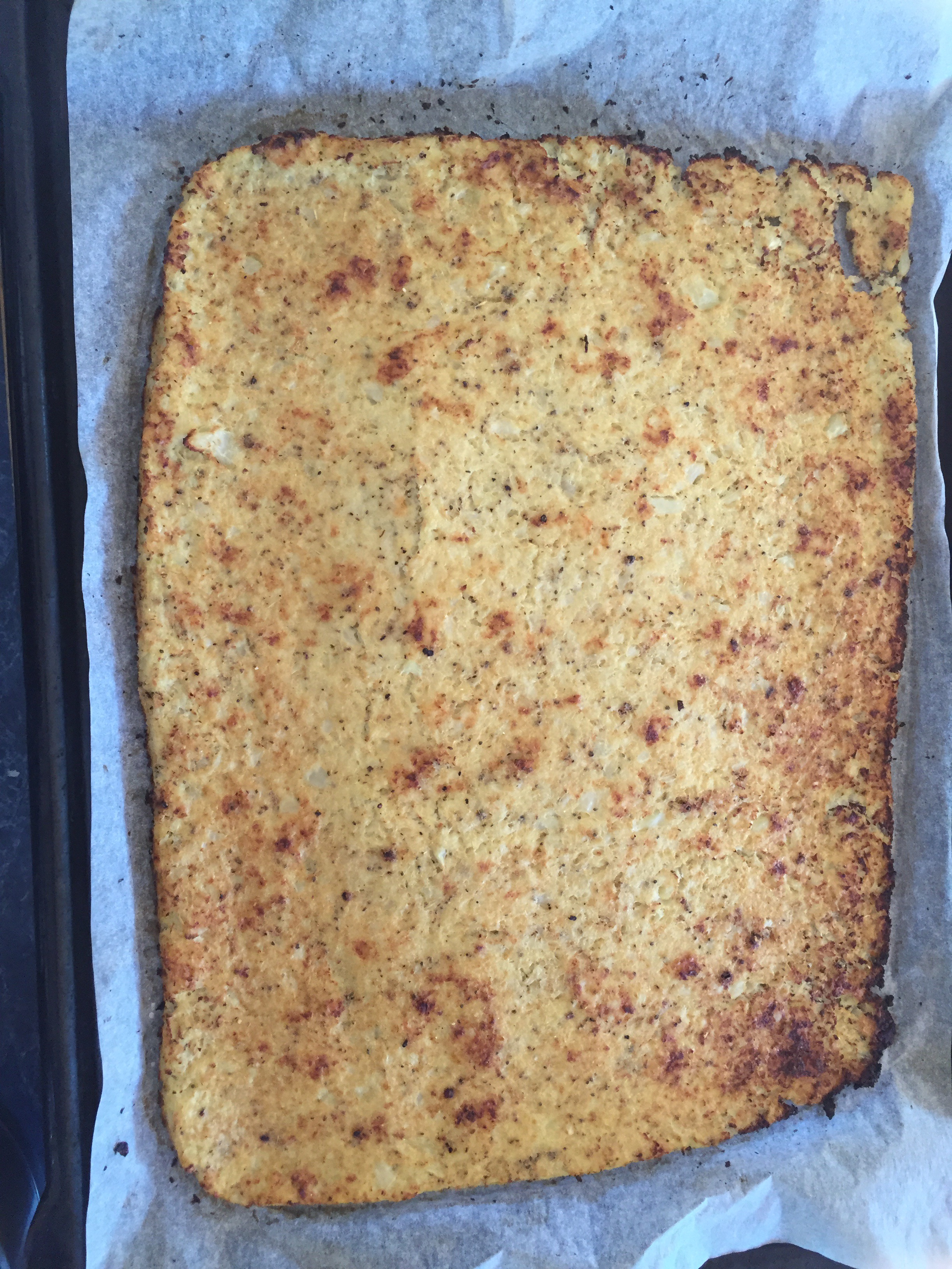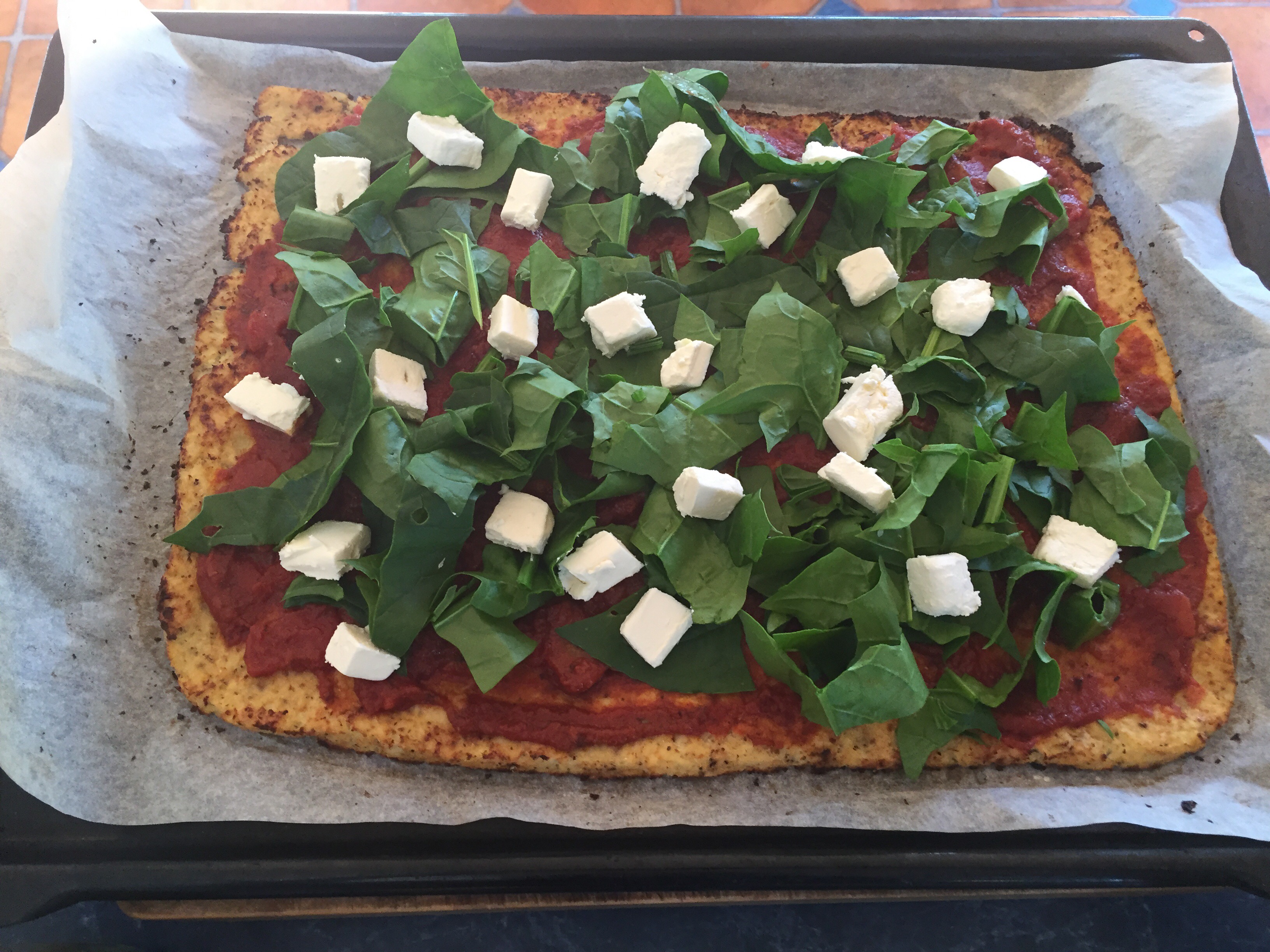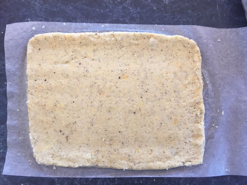 Press down and spread out until about 1/2 cm thick, you can use another piece if bake paper and a rolling pin to help. Make the edges a bit thicker.