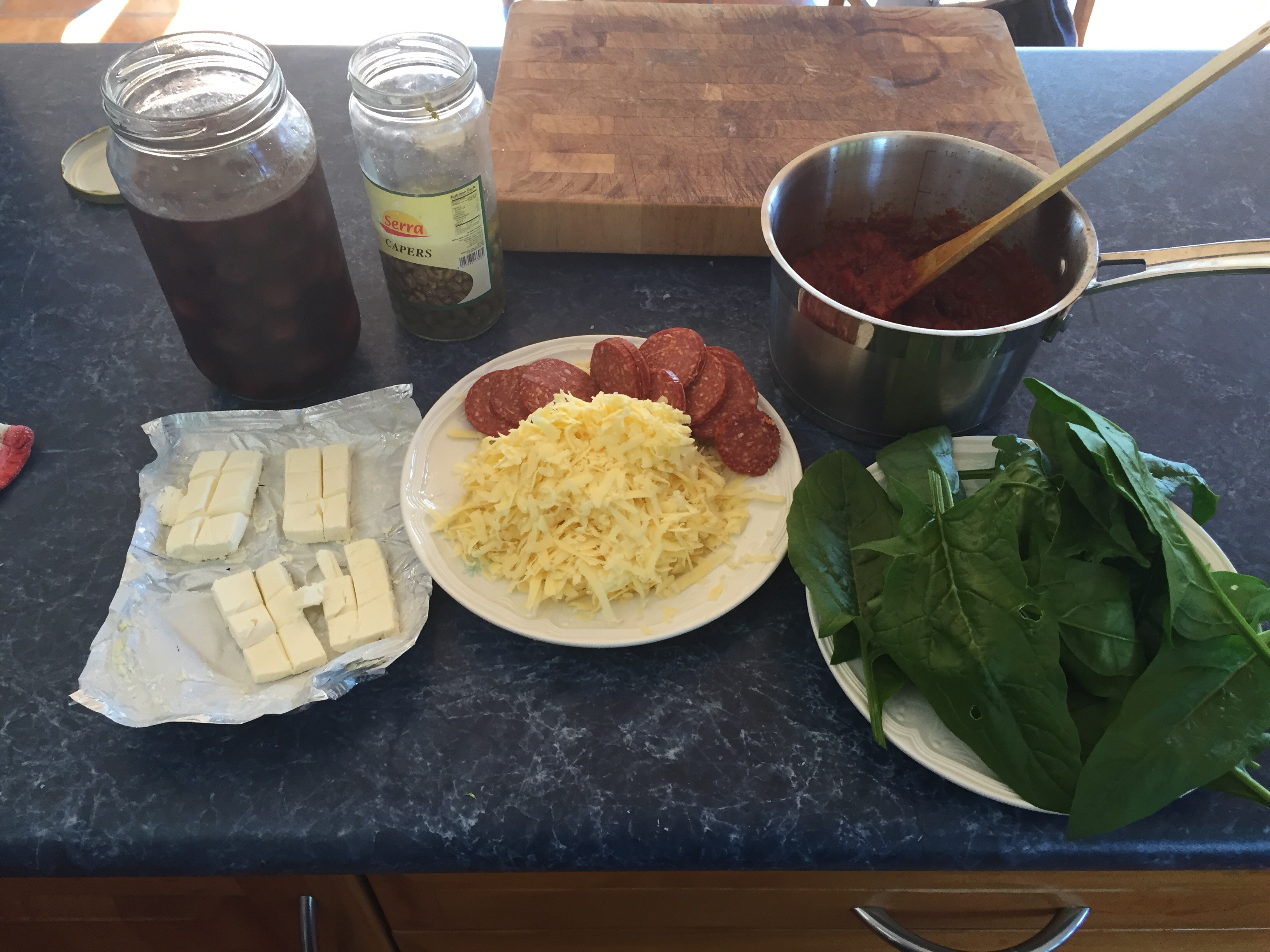 Gather all your toppings, I am using a quick home made tomato sauce, just reduce half a tin of chopped tomatoes down with olive oil until thick and yummy, capers, olives, pepperoni, cream cheese, cheddar cheese and spinach.